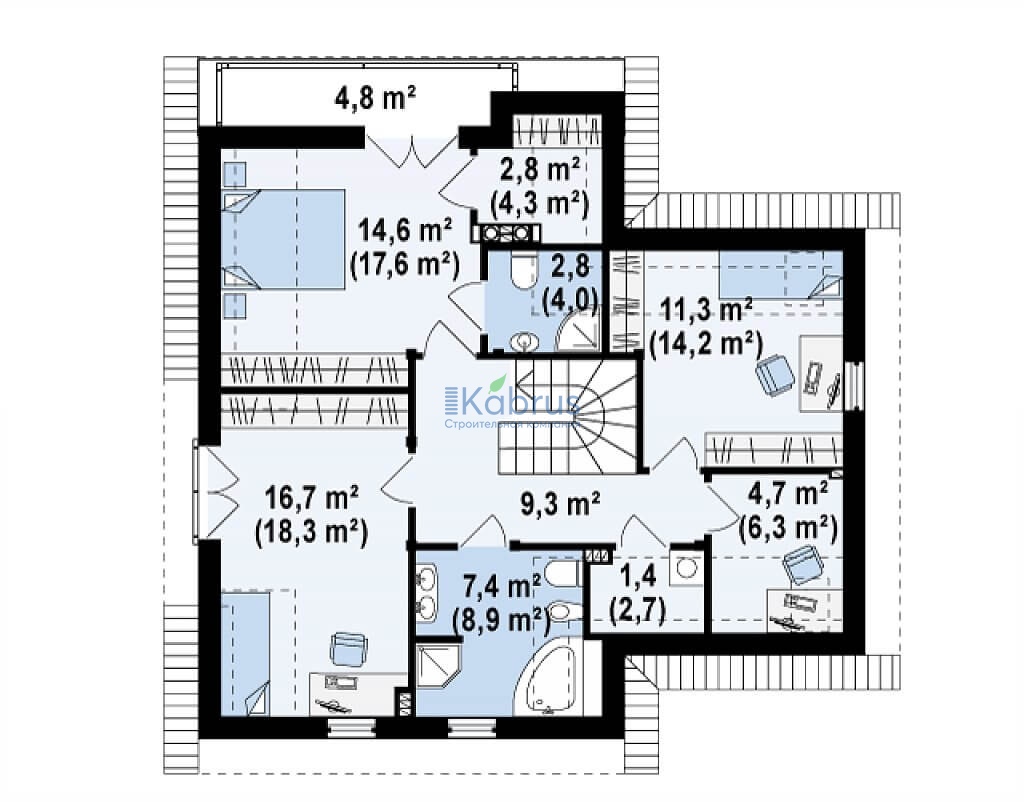 На втором этаже стандартной планировкой предусмотрены три спальные комнаты, площадь которых ㅡ17,6м2, 18,3 кв.м. и 14,2 кв.м. Одна из спален имеет выход на балкон - 4,8 кв.м. и небольшую кладовую (4,3 кв.м.), которую можно использовать в качестве гардеробной, и санузел площадью 4м2. Такая планировка спален общепринята в странах Европы, и это действительно очень удобно. Ещё на втором этаже есть второй санузел (8,9 кв.м.), подсобное помещение и небольшая комната площадью более 6 кв.м, в которой можно оборудовать кабинет или небольшую библиотеку.